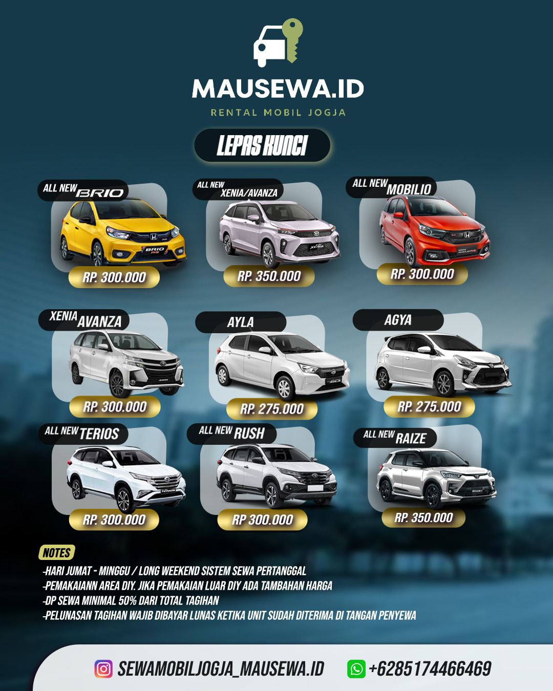 Solusi transportasi terpercaya untuk perjalanan wisata, dinas, dan aktivitas sehari-hari di Yogyakarta dan sekitarnya. Kami hadir untuk membuat trip kamu lebih nyaman, fleksibel, dan bebas ribet, baik itu untuk liburan keluarga, perjalanan bisnis, maupun eksplorasi destinasi lokal yang penuh pesona, serta pilihan yang fleksibel dengan driver ataupun lepas kunci.